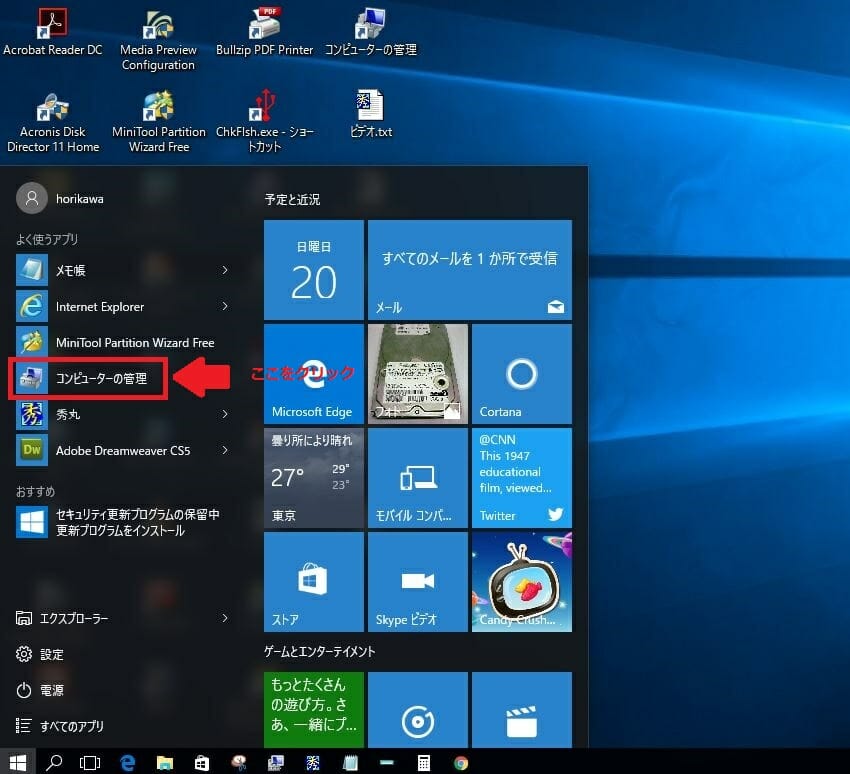 1.まず、スタートボタンからコンピュータの管理画面を開きます。